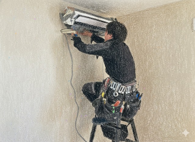 - こんにちは、陽子です。 先日、完成見学会の準備中、 作業着のカタログに出てきそうな彼は、 エアコン取付中です!…