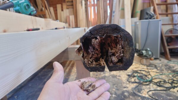 水分を含んだ木質に、腐朽菌が付着し繁殖、その菌を食べに来るアリ、その繰り返しで、木がボロボロとなってしまいます。