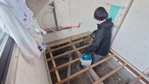 と、その前に、解体して現れた既存の土台と根太に、ホウ酸系防蟻剤の『エコボロン』を塗布しました。