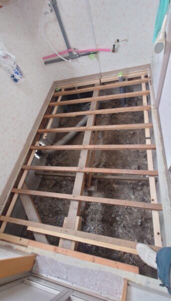 洗面脱衣室の床がブカブカするとの事で、下地材の張り替え工事となりました。
