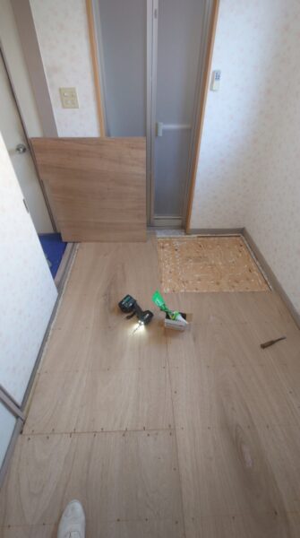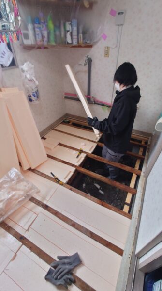 根太と根太の間に断熱材をはめ込み、その後、構造用合板、ラワン合板と2重に床板を貼り付けていきます。