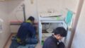 根太と根太の間に断熱材をはめ込み、その後、構造用合板、ラワン合板と2重に床板を貼り付けていきます。