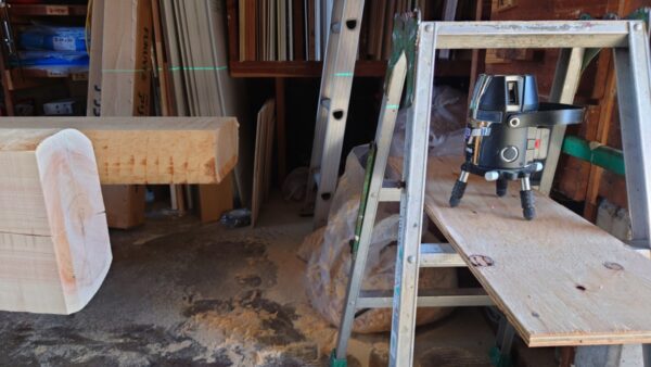 真っ直ぐな所が無いので、基準となる印を、垂直が出る機材を使って、丸太梁に印を付けます。