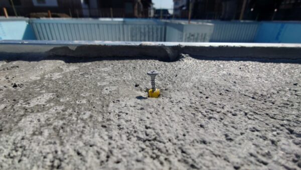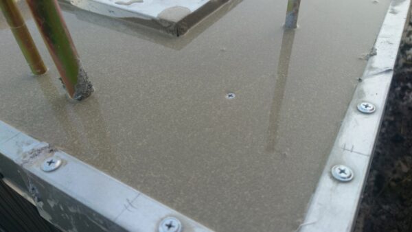 混ぜ終えたら、各所に打ち込んだ、高さを揃えたビスの頭がほんの少し見える位迄流し込みます。