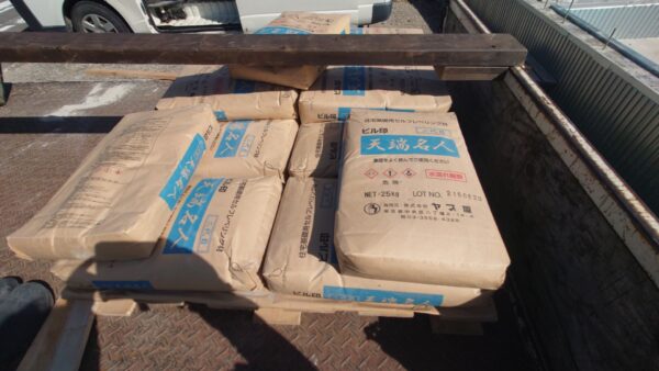 水と天端名人をバケツに入れ、撹拌機でしっかり混ぜます。