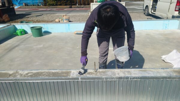 基礎の天端を平らにする、流動性コンクリートな『レベラー』を流し込む前に、しっかり接着するよう、シーラーを塗ります。