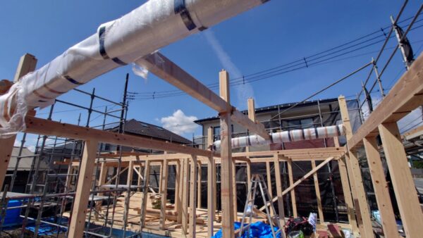 今までの雨が嘘のようなくらい、お天気晴れ晴れの日の、棟上げとなりました。