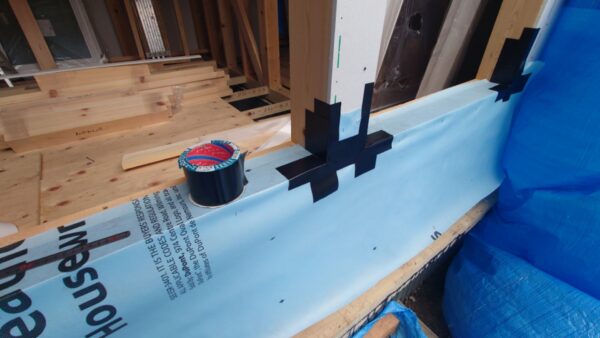 その上からサッシを留め付ける事によって、万が一サッシ枠から雨水が侵入した際、外に排出する様にしています。