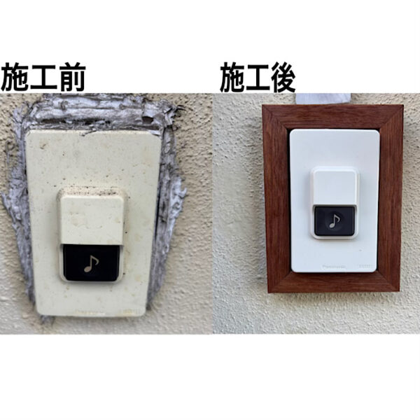 玄関チャイムが鳴らなくなってしまったことと、玄関が新しくなったことでその近くにある既存の押しボタンの周りに沢山付いていたコーキングが気になるといったこともあり交換となりました。