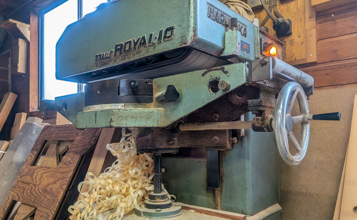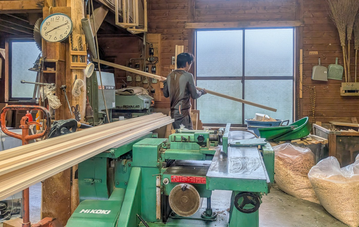 社員大工の丸山が機械で加工中