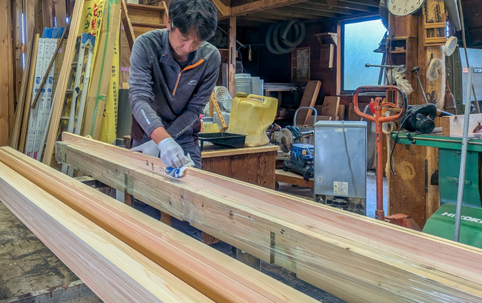 定番の柿渋ワックスで塗ります