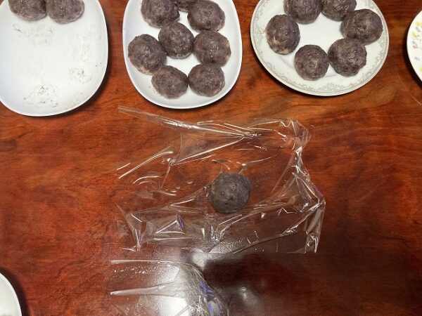 大急ぎで作るには、ビニール手袋が邪魔すぎて、均等に餡がつきません(T_T)。