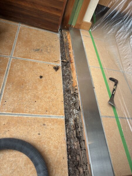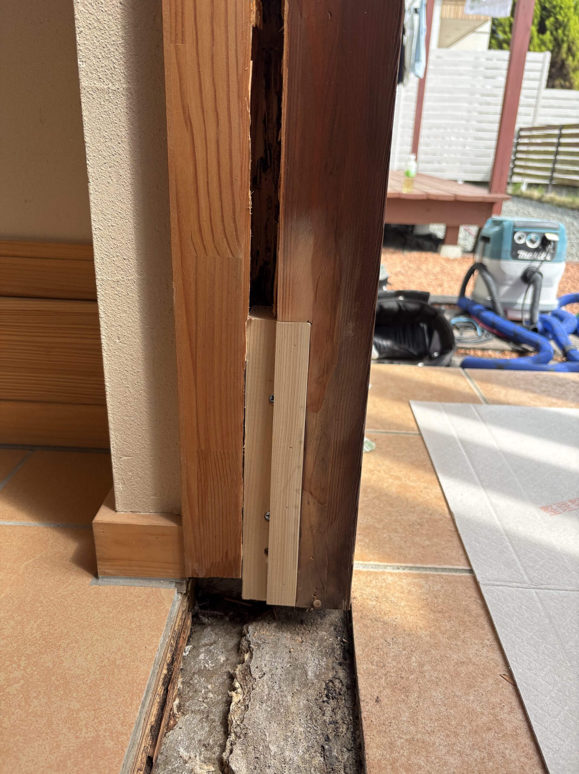 玄関タイルとポーチのタイルの取り合い部分にあるやつの木下地がごっそりやられてます、、